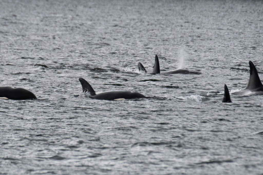 Residents vocalise far more often than Bigg’s, and they are generally more surface-active and “playful” [10], which was certainly true during this encounter. With our engine shut down, the whales began surfacing around us, even rolling upside down and swimming backwards as they passed. We lowered our hydrophone to listen in on their calls. Dr. Volker Deecke, our onboard killer whale specialist, quickly recognised them as A-clan calls. Northern Residents are grouped into three acoustic clans, each defined by its own unique call type [9]. Later, photo ID confirmed the presence of A35 and A24 matriline members within the group.